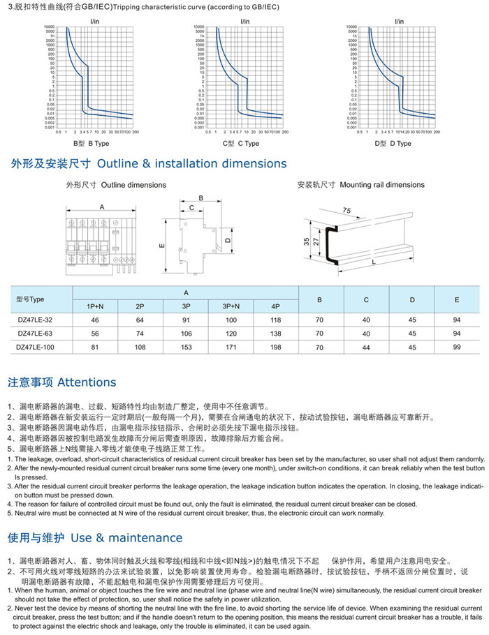 DZ47LE-63系列漏電斷路器,適用于交流50Hz或60Hz,額定電壓?jiǎn)蜗?/span>230V,三相400V及以下,額定電流1-100A電路中,當(dāng)人身觸電或電網(wǎng)泄漏電流超過(guò)規(guī)定值時(shí),漏電斷路器能在極短的時(shí)間內(nèi)迅速切斷故障電源,保護(hù)人身及用電設(shè)備的安全,同時(shí)具有過(guò)壓、欠壓、過(guò)載、短路等保護(hù)功能,亦可作為線路的不頻繁轉(zhuǎn)換及電動(dòng)機(jī)的不頻繁起動(dòng)之用。本產(chǎn)品體積小,重量輕,外形美觀,導(dǎo)軌安裝,使用方便。