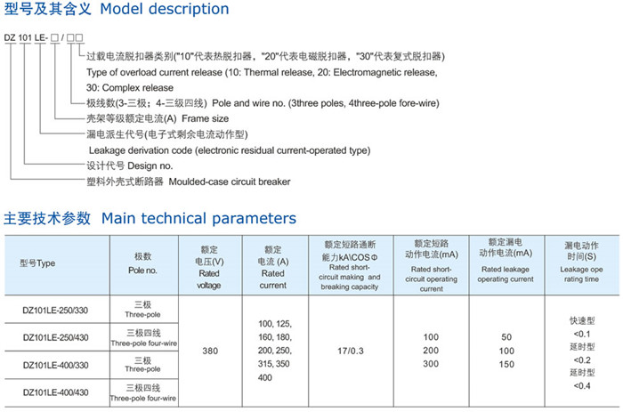 DZ101LE系列漏電斷路器是由DZ10塑料外殼式斷路器派生而成,具備斷路器功能外,為了防止人身觸電及線路漏電,在斷路器上加裝漏電脫扣器,設(shè)計(jì)成具有過(guò)載、短路、漏電:種保護(hù)為一體的產(chǎn)品。該產(chǎn)品是目前大容量線路器中較為理想的漏電保護(hù)電器。并符合IEC75-92、IE947.2國(guó)際標(biāo)準(zhǔn)及GB6829-95、CB14048.2-94國(guó)家標(biāo)準(zhǔn)。