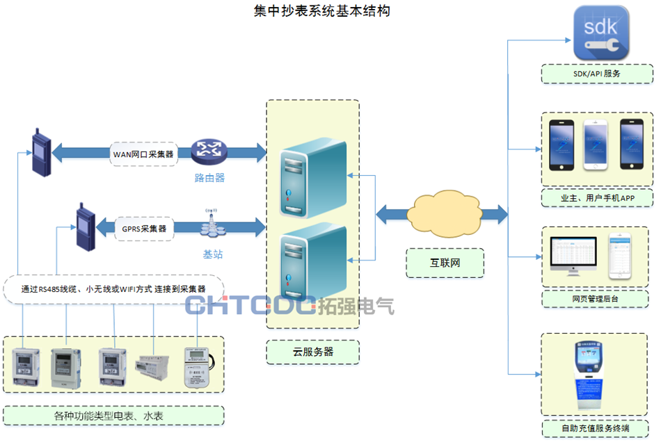 本系統(tǒng)由水電表,云服務(wù)器,數(shù)據(jù)采集器,手機APP,網(wǎng)頁后臺,自助充值終端等組成