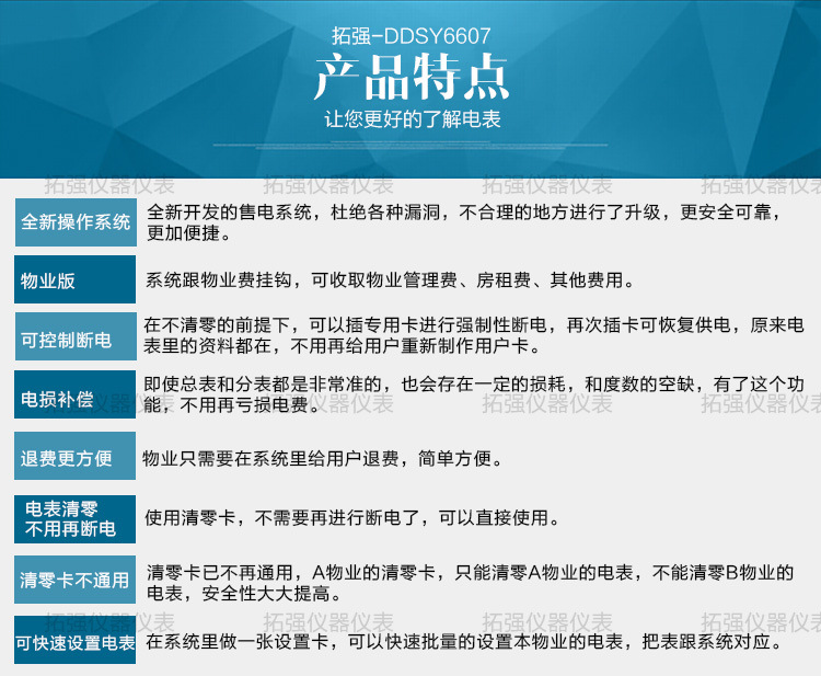 主要特點(diǎn):應(yīng)用計(jì)算機(jī)管理,先購電后用電;在額定電流范圍內(nèi)能限制最大使用功率(由供電部門限定);一表一卡,??▽S?,失卡不失電,補(bǔ)卡再用;電卡能雙向傳遞數(shù)據(jù),能自動(dòng)斷電告警用戶購電;電量為零時(shí),自動(dòng)拉閘斷電;并具有一定的防竊電軟件設(shè)計(jì)等。